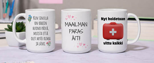 Kuppikaupan valikoimasta löydät myös lahjat, jotka sopivat täydellisesti tärkeimpiin perhejuhliin. Etsi meiltä lahja isälle tai lahja äidille ja yllätä heidät kupilla, joka kertoo rakkaudesta ja huumorista samaan aikaan. Isänpäivälahja voi olla käytännöllinen termosmuki mökkireissuille, kun taas äitienpäivälahjaksi sopii täydellisesti kaunis ja sydämellinen kahvikuppi, joka tekee aamusta lämpimämmän.
