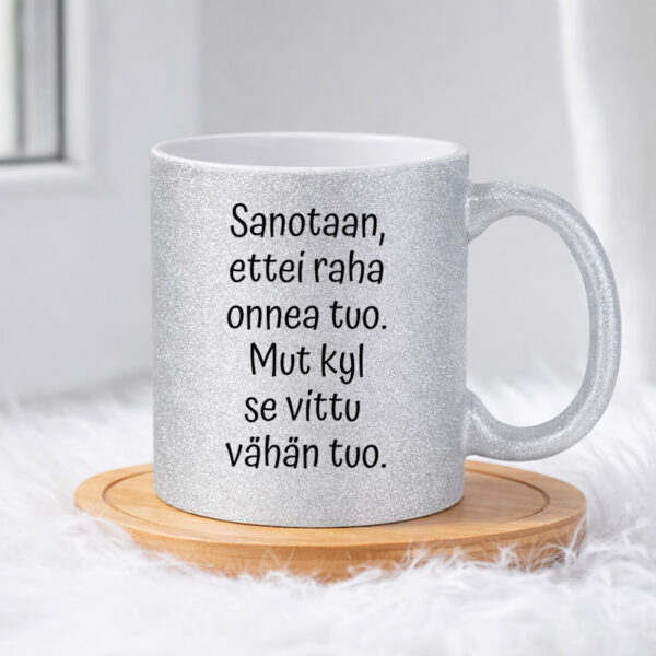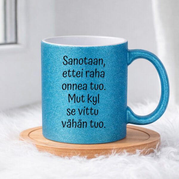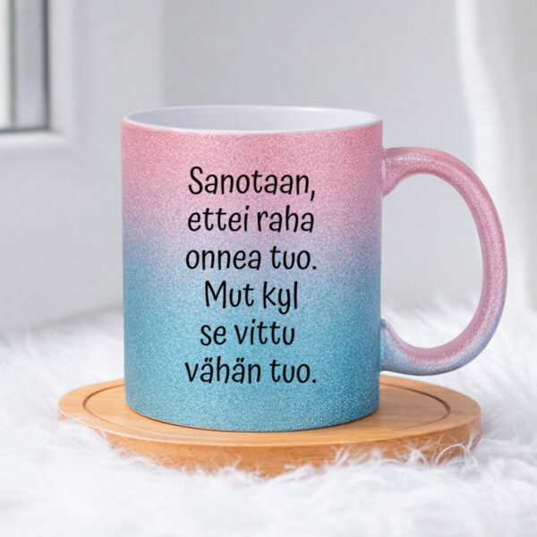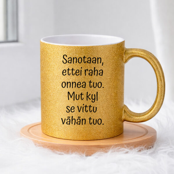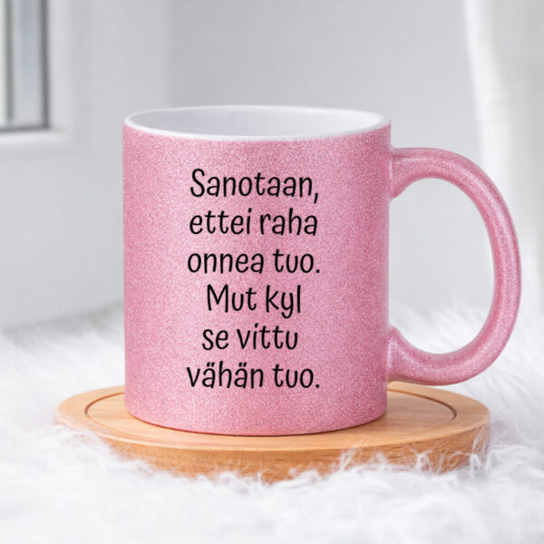 Sanotaan ettei raha onnea tuo. Mut kyl se vittu vähän tuo. (0148) | Glittermuki 330ml