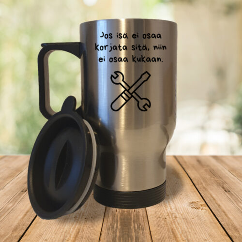 Painatus tehdään Suomessa, ja termosmuki pitää juoman lämpimänä vaikka aamu alkaisi takkuisesti. Tämä muki on yhtä aikaa hauska, rehellinen ja sopivan kahvinmakuinen – juuri kuten elämä parhaimmillaan.