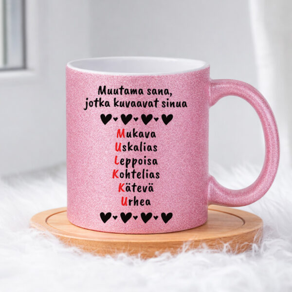 Kimaltava pinta tekee mukista katseenvangitsijan ja nostaa sanoman vielä pykälän hauskemmaksi. Tämä glittermuki toimii täydellisesti ystävänpäivänä, kun haluat antaa lahjan, joka ei ole tavanomainen, mutta kertoo silti välittämisestä pilke silmäkulmassa. Kahvihetki tästä mukista tarjoaa aina uuden mahdollisuuden huomata – ja arvostaa – piilotetun viestin.
